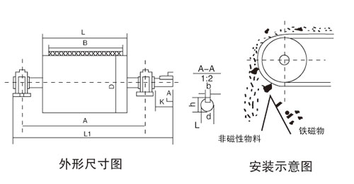 型號(hào) | 筒表磁場(chǎng)強(qiáng)度Gs | 皮帶速度≤m/s | 物料厚度≤mm | 重量kg | 外形尺寸mm | ||||||||