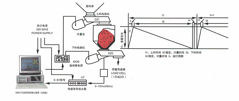 上料電振機(jī)和稱量斗是軟連結(jié)的,重力分離,下料電振機(jī)雖也是軟連結(jié),但其重力和稱量斗整體由三只拉力傳感器支撐的,由稱量斗內(nèi)料柱連結(jié)。工作時(shí)首先由上料電振機(jī)向稱量斗給料,當(dāng)達(dá)到料倉(cāng)給定重量的給定上限值時(shí),停止給料。間隔一段時(shí)間后,下料電振機(jī)開(kāi)始卸料,當(dāng)卸料至給定的重量下限值時(shí),停止卸料;如此重復(fù)動(dòng)作。物料的流量計(jì)量是由料倉(cāng)內(nèi)失去的物料重量多少來(lái)確定,因此叫失重定量給料機(jī)?! ?